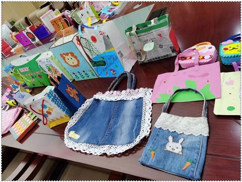 孩子们充分发挥自己的想象力与创造力,利用平时的卡纸、彩笔、太空泥等美工用品,甚至用瓜子皮等废旧物品,创造出一幅幅精美的作品。一片树叶、一座房子……各种各样有趣的图案加上精心设计的环保标语使得小小手提袋趣味十足。