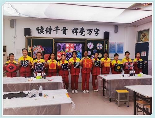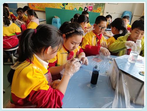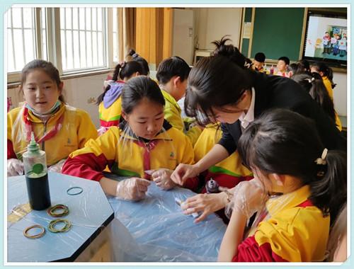 大庆路小学的扎染艺术实践工坊是以“启美”为主题美育课程的重要组成部分。扎染是一门手法独特、构思巧妙的手工印染工艺。它用最简单的手法变幻出令人回味的色彩和图案,是中华民族智慧的结晶,是生活与艺术结合的典范。它是民间美术教学一个很好的切入点,简单易学,不需要复杂的设备,图案随意,变化丰富,深受学生们的喜爱。