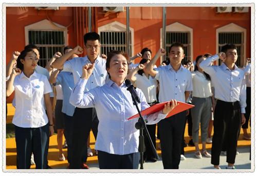 副校长王晓燕带领全体教师在国旗之下,面向全体学生做了“师德师风承诺”宣言。全体教职工郑重承诺:“我是西安北大新世纪学校的一名教师,我担负着教书育人的重任,为了认真履行教师职责,严格遵守中小学教师职业道德规范, 争做一名师德高尚、业务精湛的“四有好老师”,做好学生的“四个引路人”,我向光荣的教师职业郑重承诺:爱国守法,依法执教;育人为本、关爱学生;为人师表、廉洁从教;爱岗敬业,终身学习”。