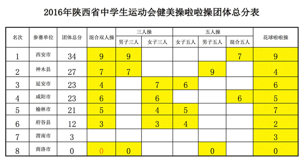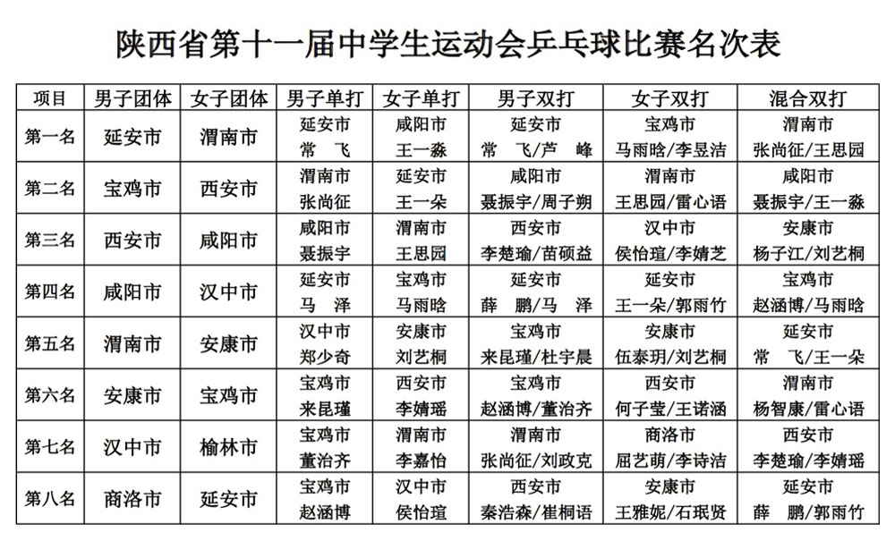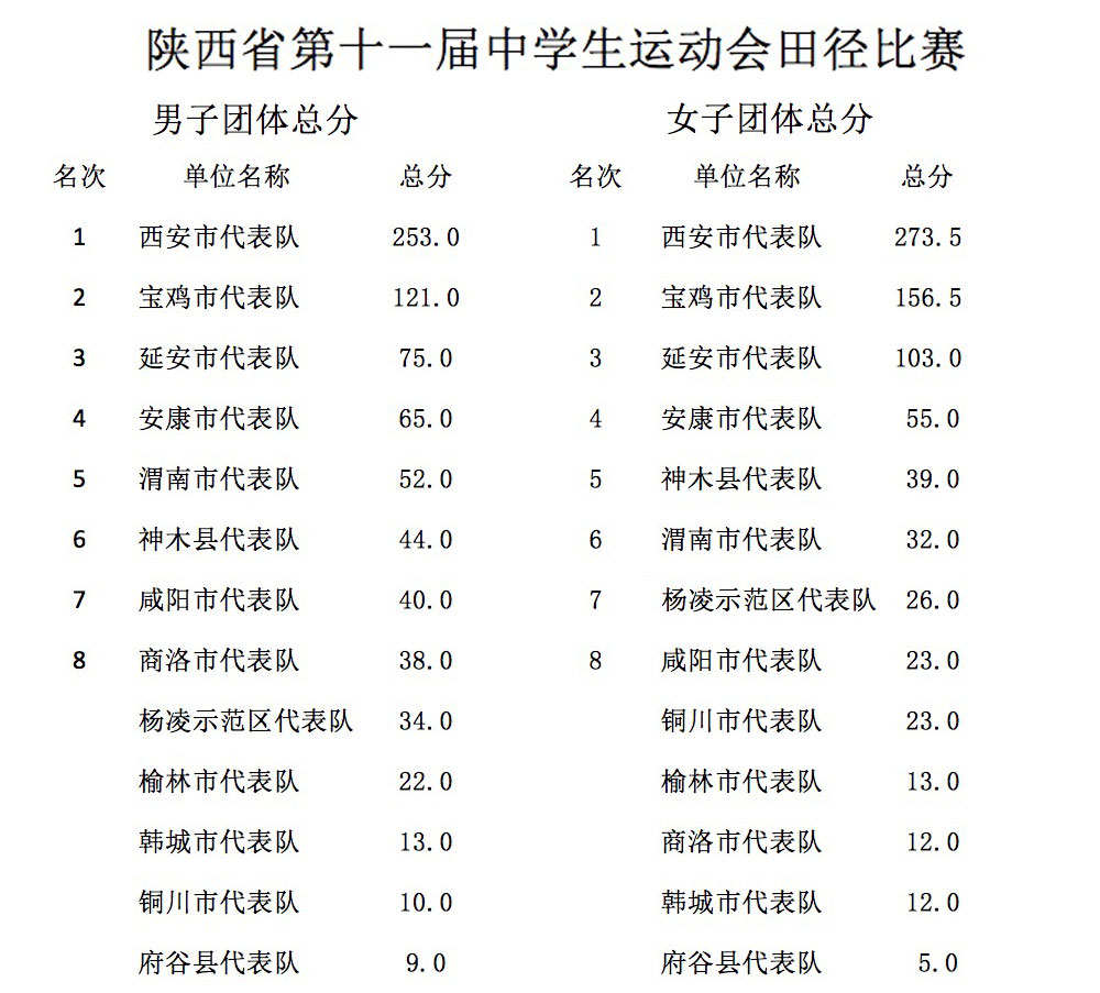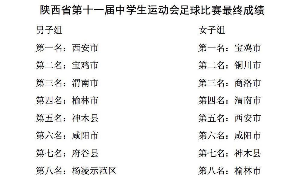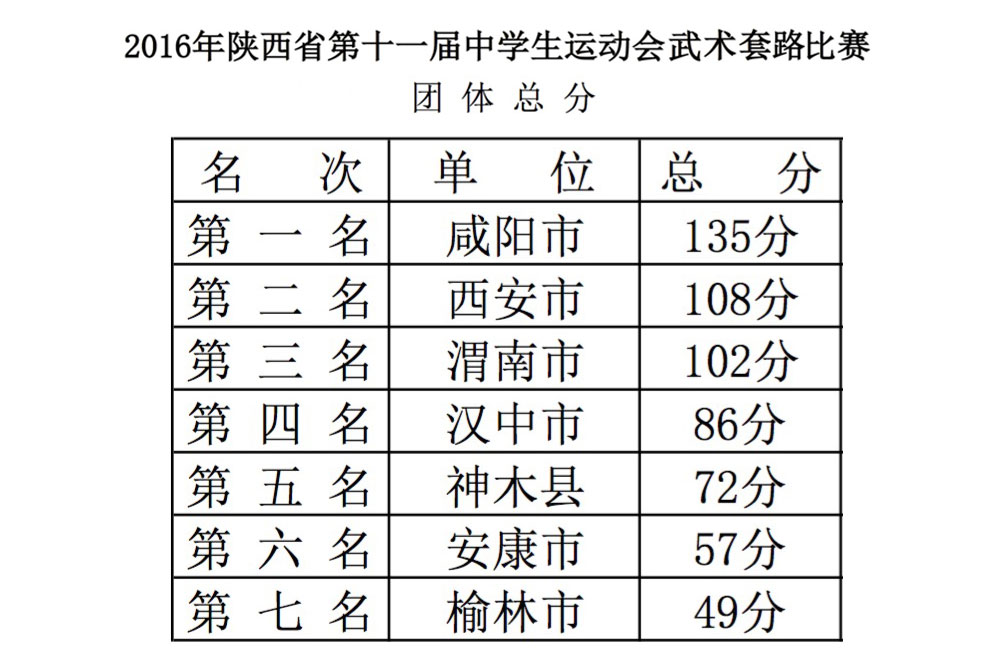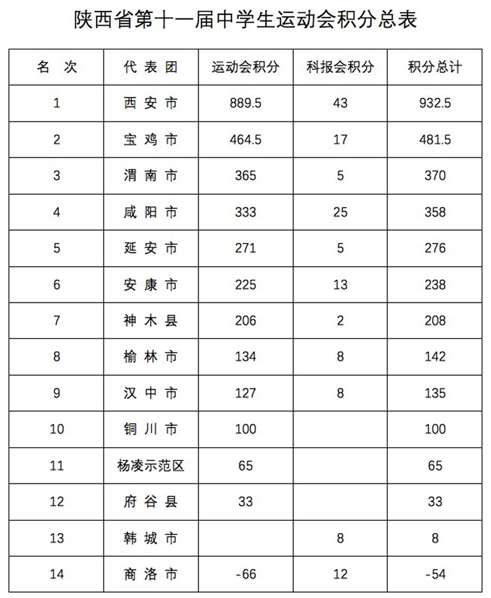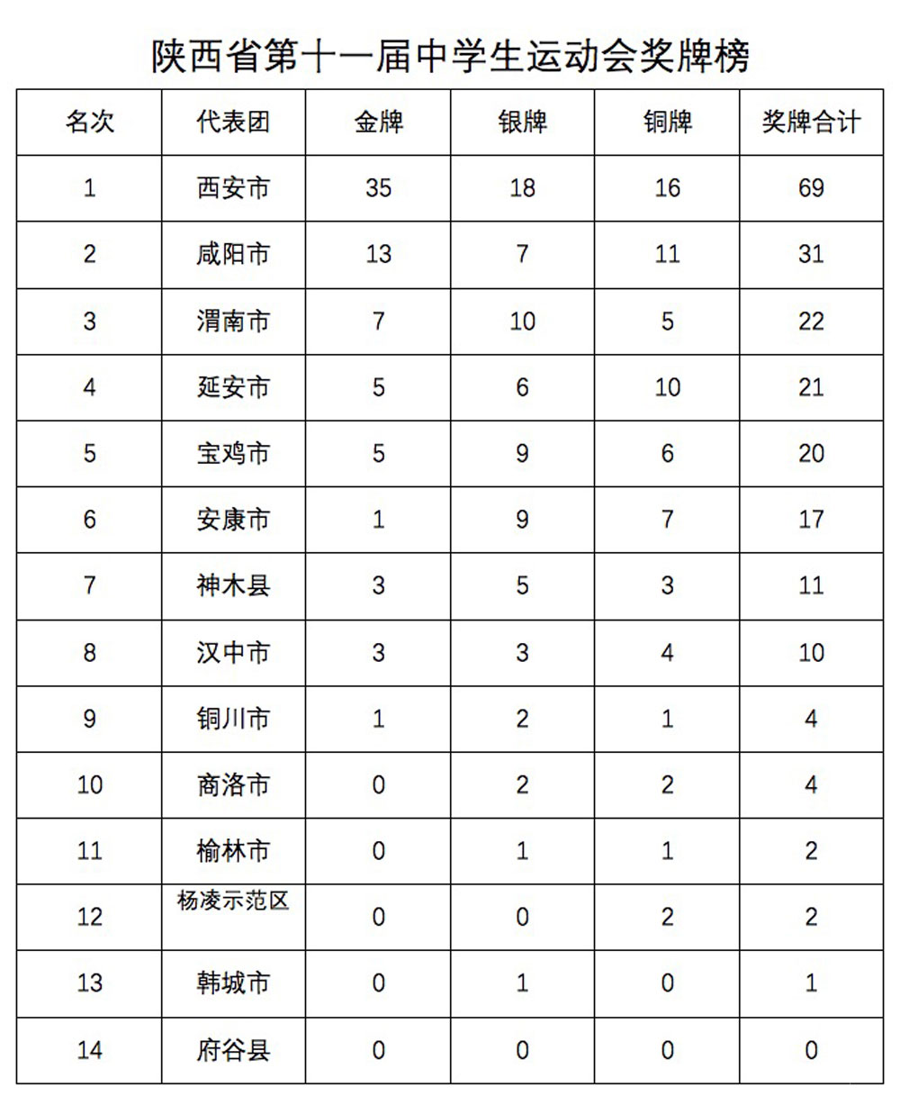 运动会自2016年7月16日至25日为期10天,于昨日2016年7月25日闭幕,2016年陕西省第十一届中学生运动会赛事成绩如下: