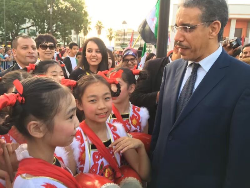 摩洛哥肯尼特拉市市长在各国代表团巡游活动表演前看望陕西省小天鹅艺术团成员。
