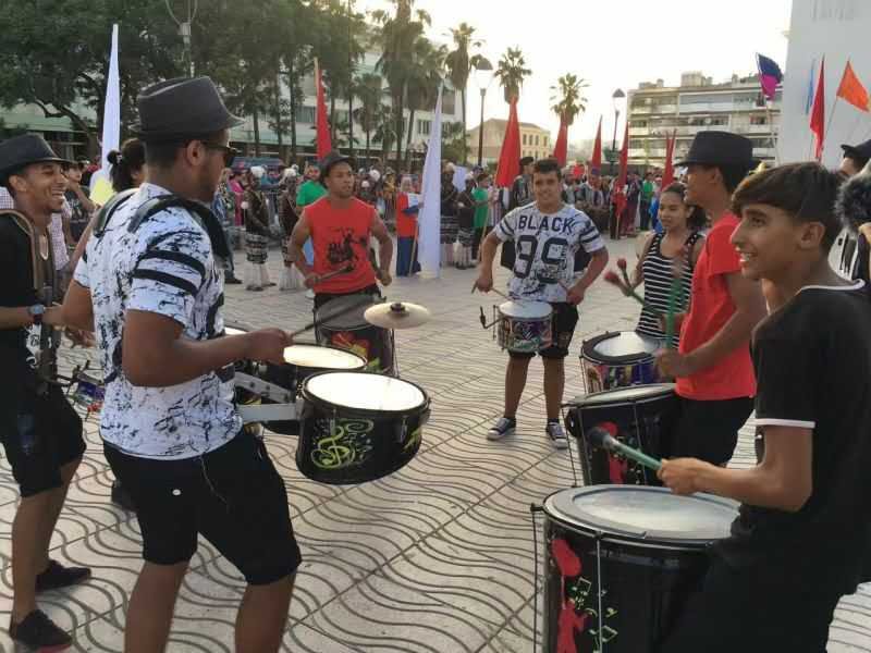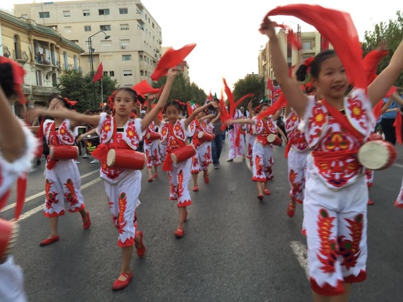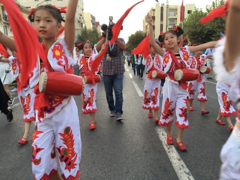 陕西省小天鹅艺术团在摩洛哥肯尼特拉市巡游活动时进行腰鼓表演。