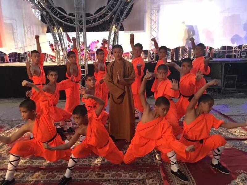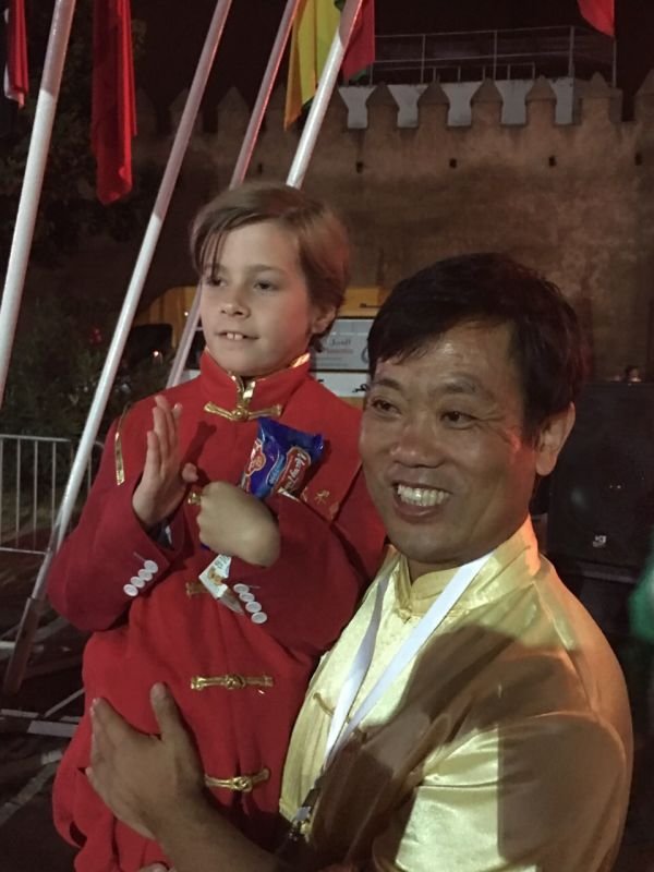 在摩洛哥第十届国际民间儿童和平节开幕式上,韩鹏院长抱起弟子……保加利亚王子观看武术表演。