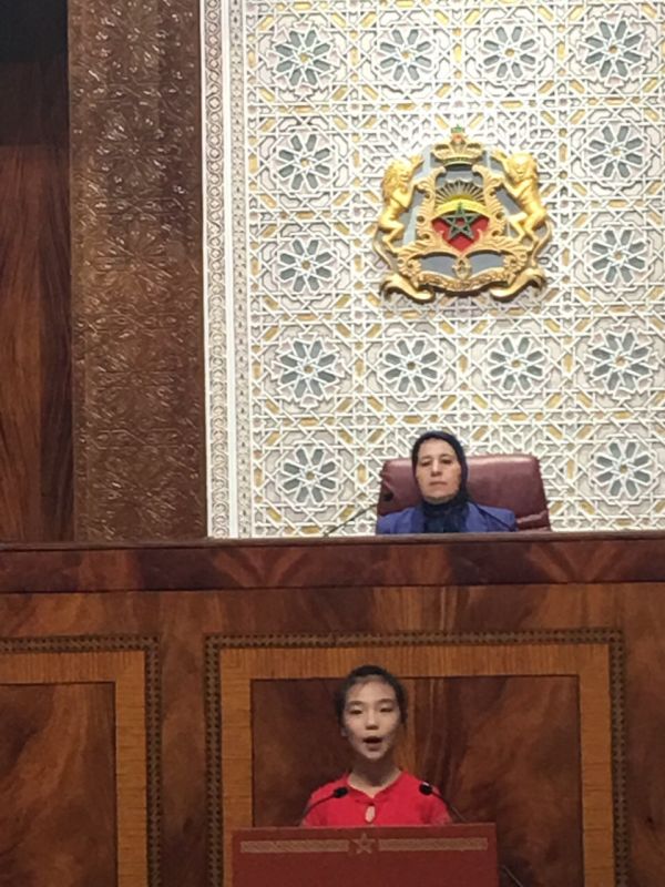 陕西省小天鹅艺术团的董婉芯同学在摩洛哥赛拉市国会大厦宣读和平宣言!