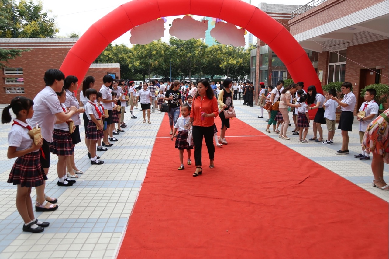 孩子们身着崭新的校服,踩着红毯,和家长一起步入校园。