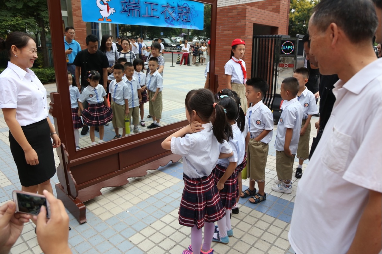 孩子们认认真真地在明亮的镜子前系扣子,正衣襟,完成知书明理的第一步——端正衣冠。