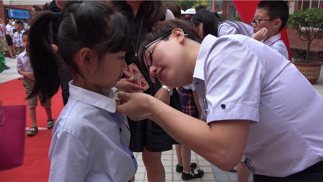 走进“入学门”,老师为孩子们佩戴闪闪的校徽。