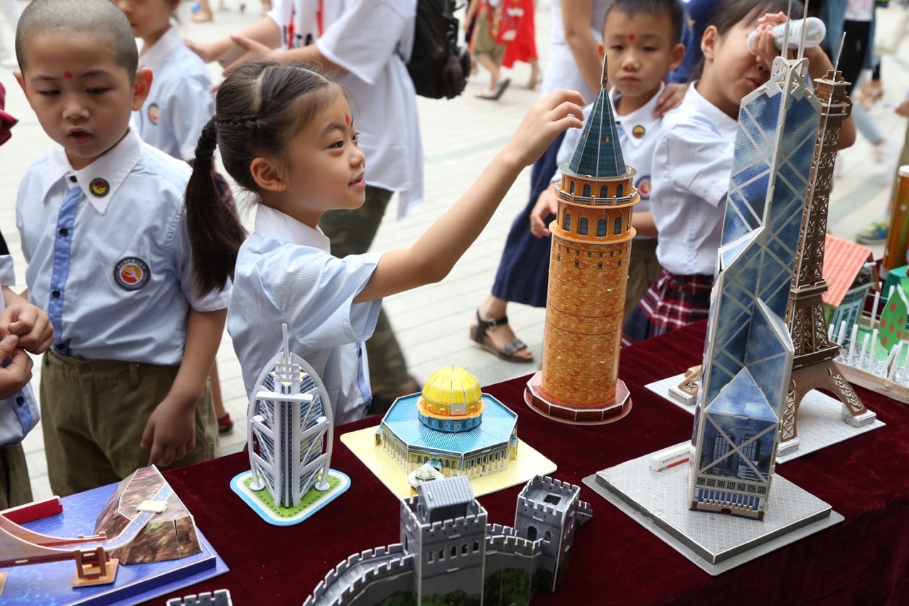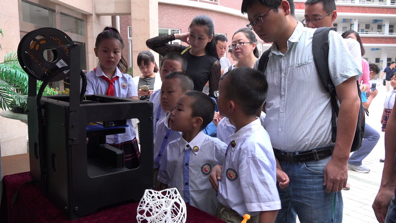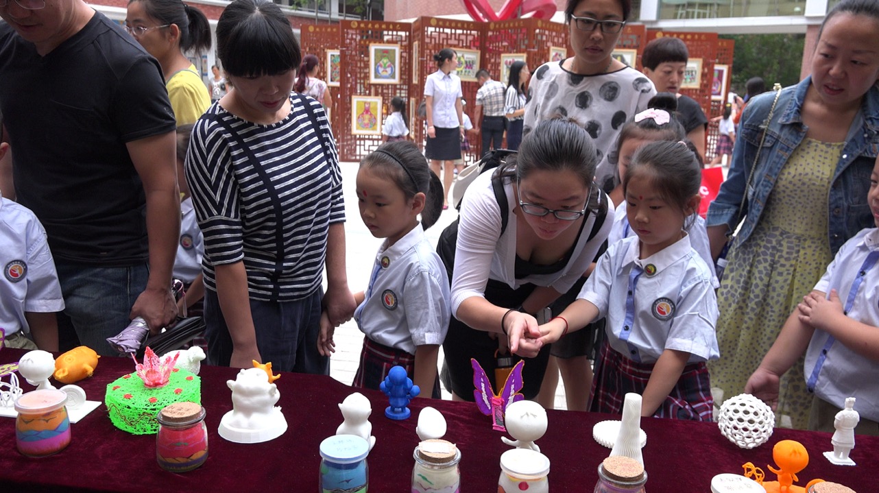 家长带着孩子驻足观看二小十五年来各个学科的成果展示。