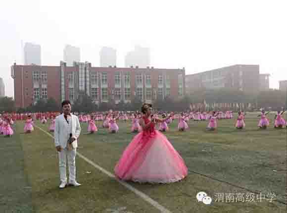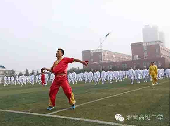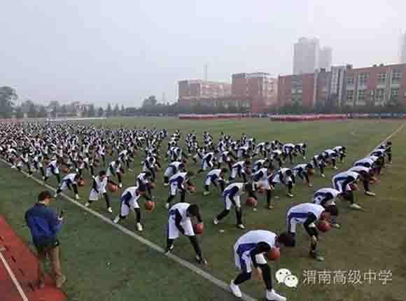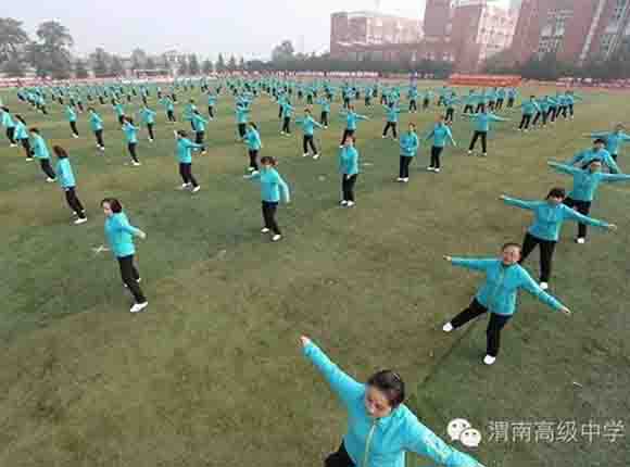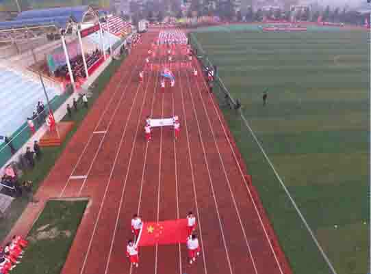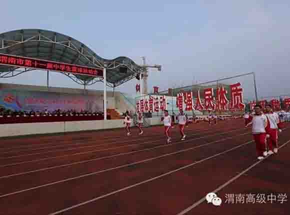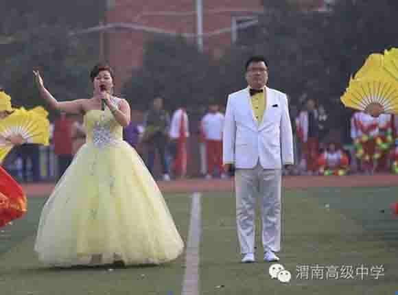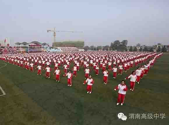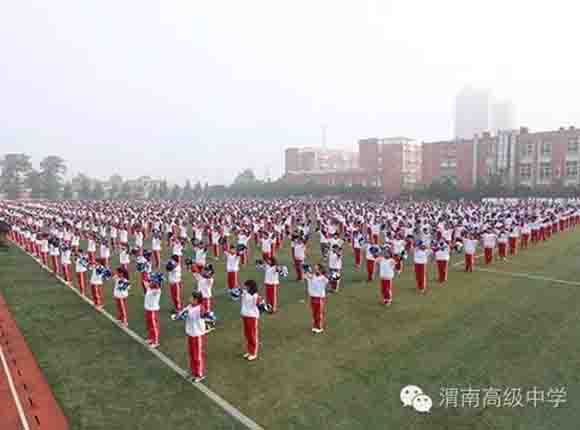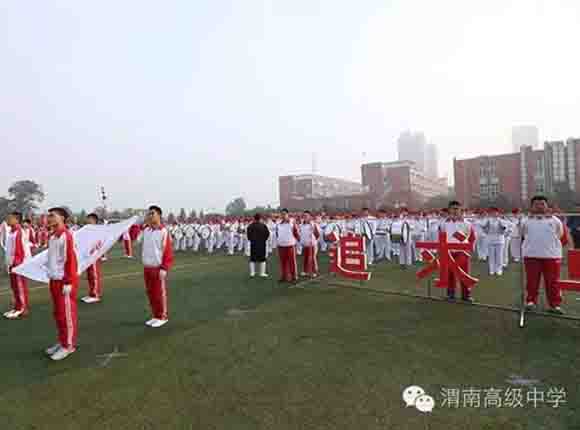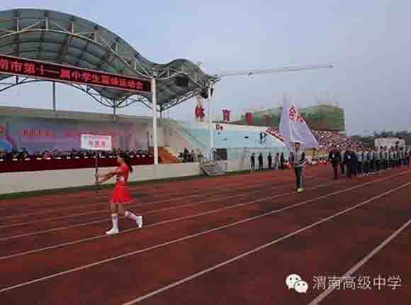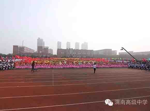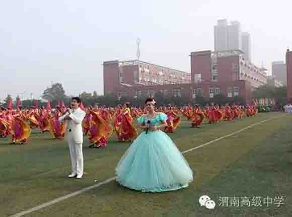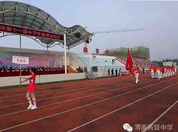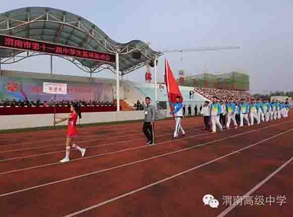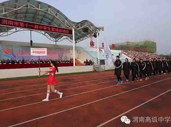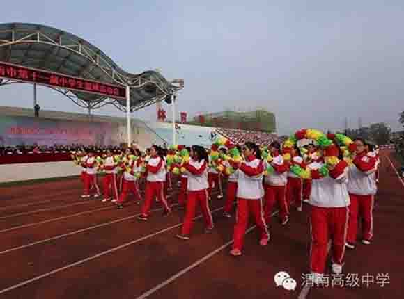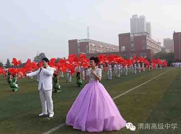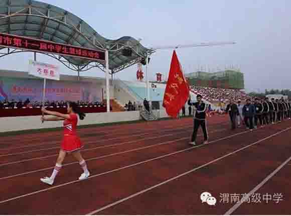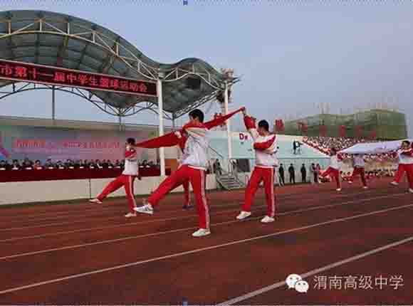 随着中共渭南市市委常委、副市长王晓军宣布运动会开幕一声令下,开幕式表演激情上演了!渭高高三奉献了极具渭高特色的跑操,只见同学们精神饱满,口号响亮,标准的姿态和整齐划一的动作体现了踏实认真和积极进取的精神。由渭高高一年级学生组成的啦啦操队伍,以其多变的形式、优美的舞姿使整个现场变得赏心悦目,焕然一新。渭高近三百名教职工组成的太极拳方队,轻柔缓慢的节拍、行云流水的动作展示了刚柔并济的太极魅力。高一高二年级400名学生组成的花式篮球表演方阵。他们把活力与激情挥洒得淋漓尽致,得到了全体师生的阵阵喝彩和欢呼,把运动会开幕式推向了高潮。渭高高二年级全体学生表演的军体拳,以整齐的服装、嘹亮的口号、变换的队形、精彩的表演,他们以别样的风采、高昂的斗志用充分展示出渭高学子的激情与活力,诠释了新时代的体育精神!踏着潇洒的节拍,和着欢快的旋律,渭高全体女教师舞动青春的旋律,她们在紧张的工作之余,广泛开展丰富多彩、积极健康、文明向上的文体健身活动,锻炼了身体,陶冶了情操。她们是渭高一道靓丽的风景线!绚丽的五彩汇成欢乐的海洋,嘹亮的歌声唱响盛世的雄章。由李苗、陈放、王山英、李欣、李姗姗、石盟、张娟、李炳林等八名音乐教师在今天这个欢乐的日子里,唱响渭高,所有伴舞均来自渭高高一高二年级共400名学生。