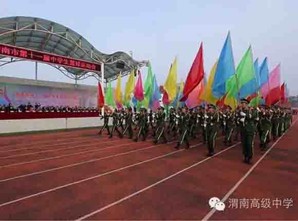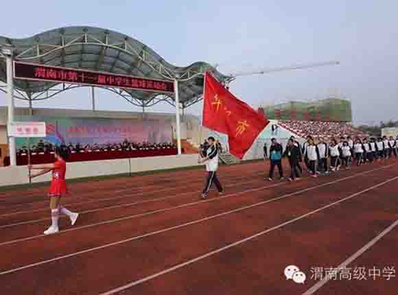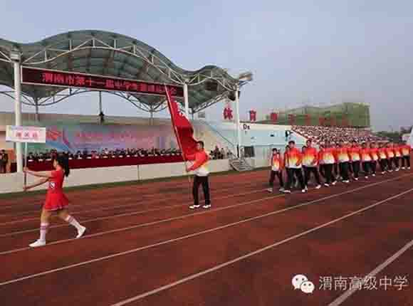 在全场奏响了壮严的国歌后,校国旗队四名旗手率先步入会场,在他们的引领下,手擎会旗、会徽、渭南高级中学办学理念、校训方队、运动会标语方阵、300人军乐团方阵、百人彩旗方阵以及各县区及我校共13支代表队迎着明媚的阳光,伴随着激昂奋进的《运动员进行曲》依次入场,走向主席台接受检阅。整齐划一的步伐、铿锵有力的动作、嘹亮激情的口号、别出心裁的展示无不显示出学子们蓬勃向上的精神面貌。