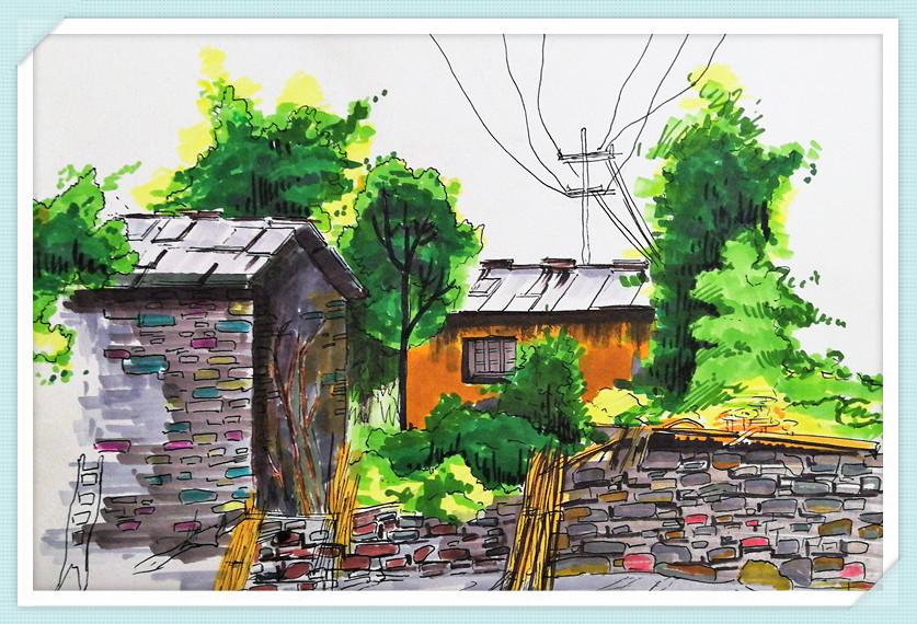 > 绘画 > 马克笔画《村庄》 彩铅画《牵牛花》