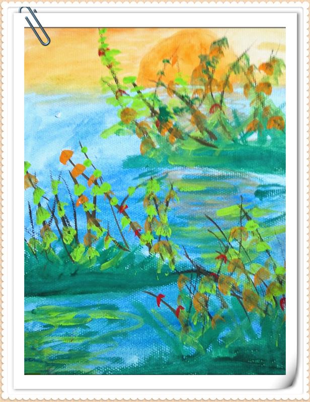 > 绘画 > 水粉画《夕阳下的河边》